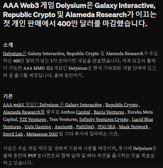 지금까지 델리시움(Delysium)의 트레일러 영상, 플레이 영상, 투자사와 파트너 등으로 대략적으로 어느 정도 회사인지 간접적으로 알아보았습니다.