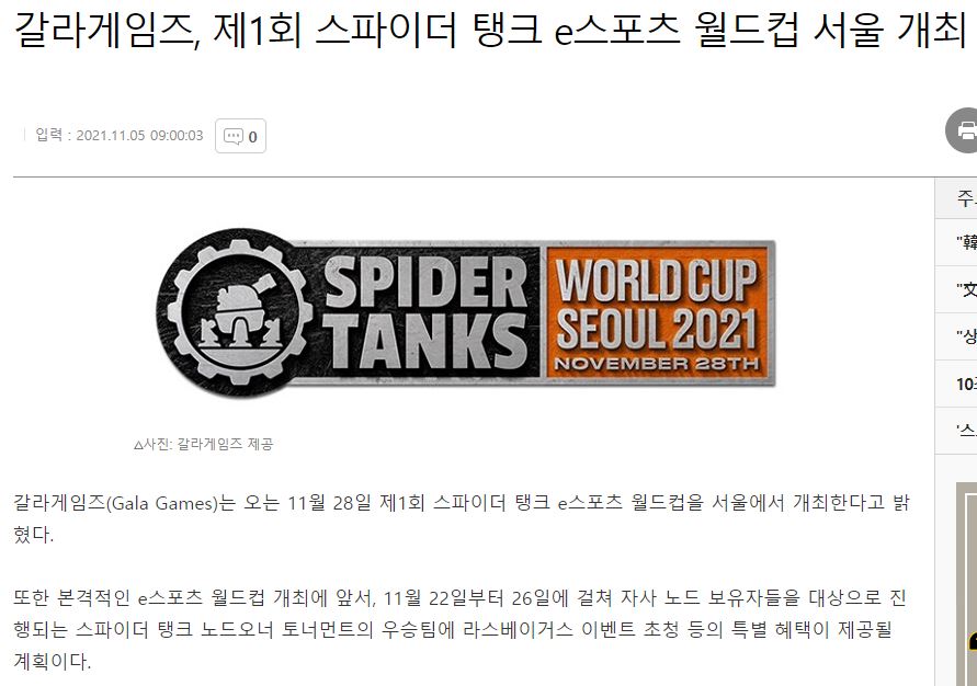 11월 28일에 제 1회 스파이더 탱크 e스포츠 월드컵을 서울에서 개최합니다!