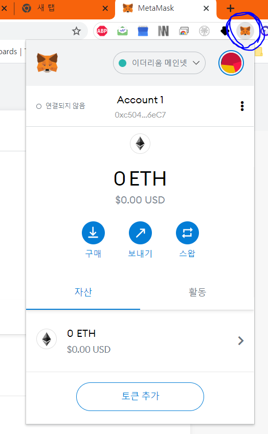 또한 크롬 확장프로그램이여서 오른쪽에 있는 메타마스크(MetaMask) 아이콘을 누르면