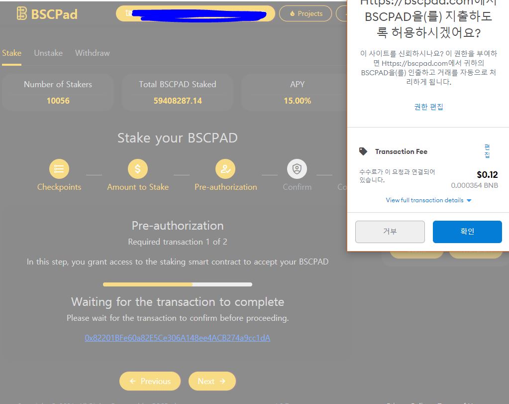 IDO에 참여하기 위해서는 BSCPAD 코인을 스테이킹해야하는데