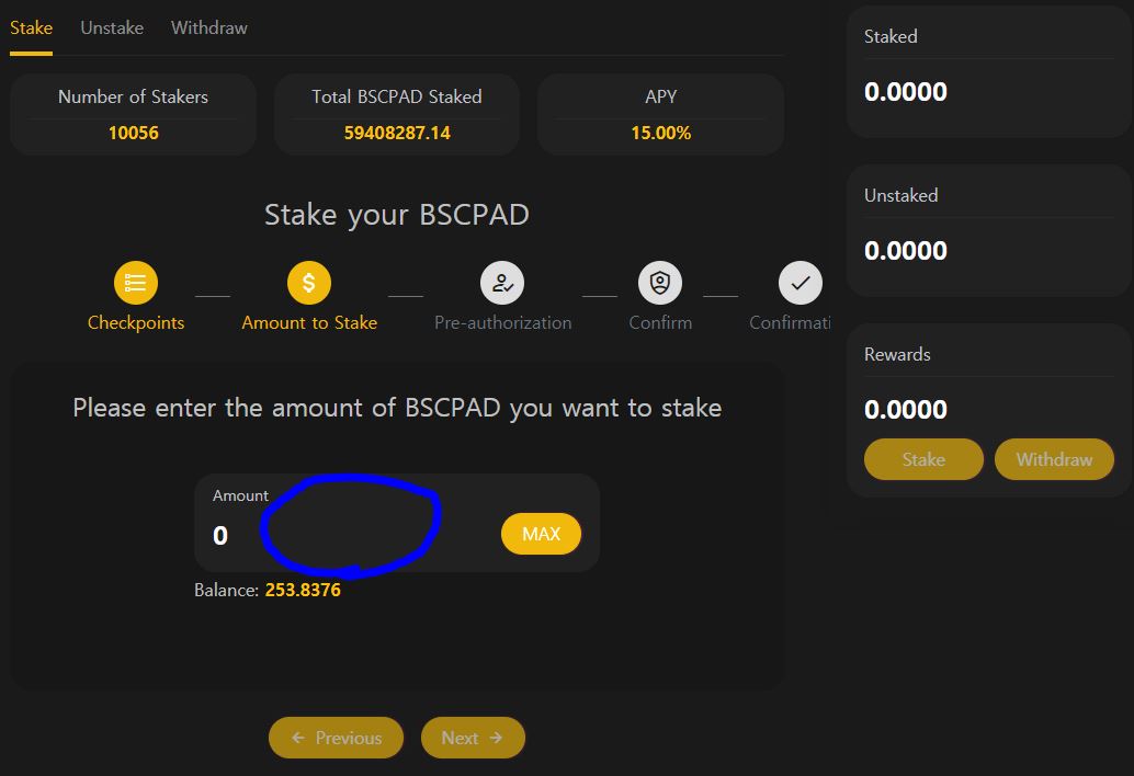 스테이킹할 BSCPAD 수량을 입력합니다.