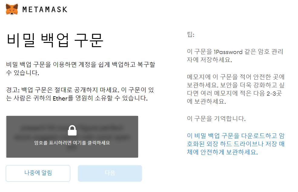 메타마스크(MetaMask)는 시드 구문만 알고 있으면 어느 컴퓨터에서든지 지갑을 가져올 수 있습니다.