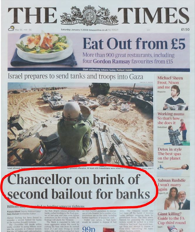 이 블록안에는 2009년 1월 3일 'THE TIMES' 헤드라인 제목과 일치하는